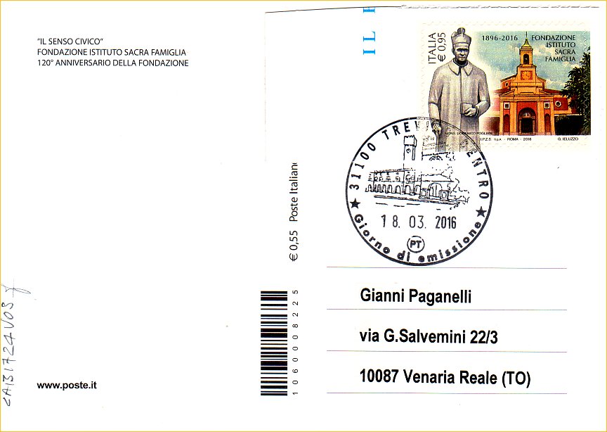IT3729 - 18/03/2016 - CAB1724 - 1v - Fondazione Istituto Sacra Famiglia - € 0,95