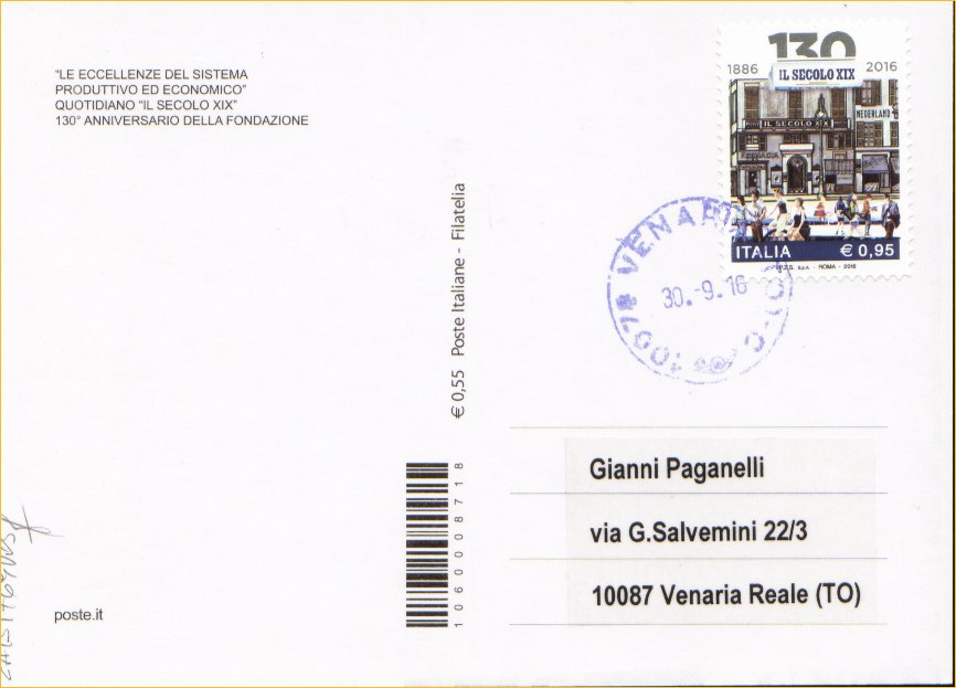 IT3783 - 30/09/2016 - CAB1769 - 1v - 130º anniversario della fondazione del quotidiano Il Secolo XIX