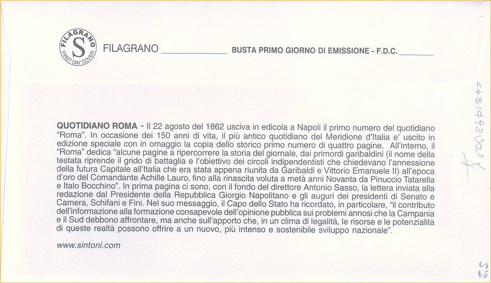 IT3394 - 10/09/2012 - CAB1492 - 1v - Quotidiano Roma , nel 150° anniversario della prima pubblicazione