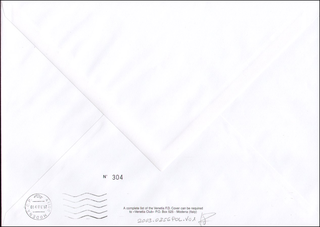 Questa busta è affrancata con un foglietto emesso congiuntamente con la Città del Vaticano (BF26) posto sulla busta nr.vat2003_0356_v01