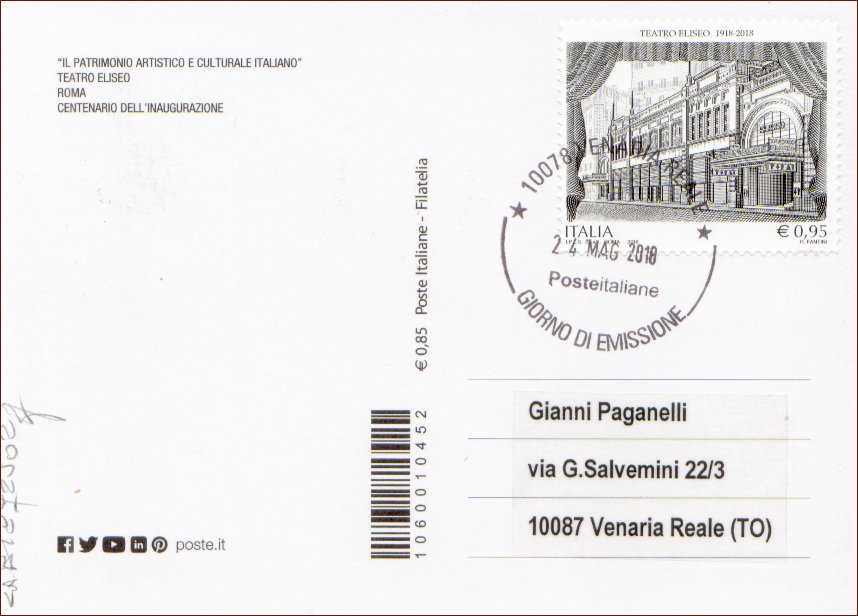 IT3886 - 24/05/2018 - CAB1872 - 1v - 100° anniversario dell´inaugurazione del Teatro Eliseo, a Roma