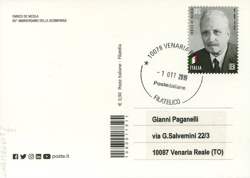 2019 IT - EM0046 - CAB1960 - 1v - 01/09/2019 - 60º anniversario della morte di Enrico De Nicola