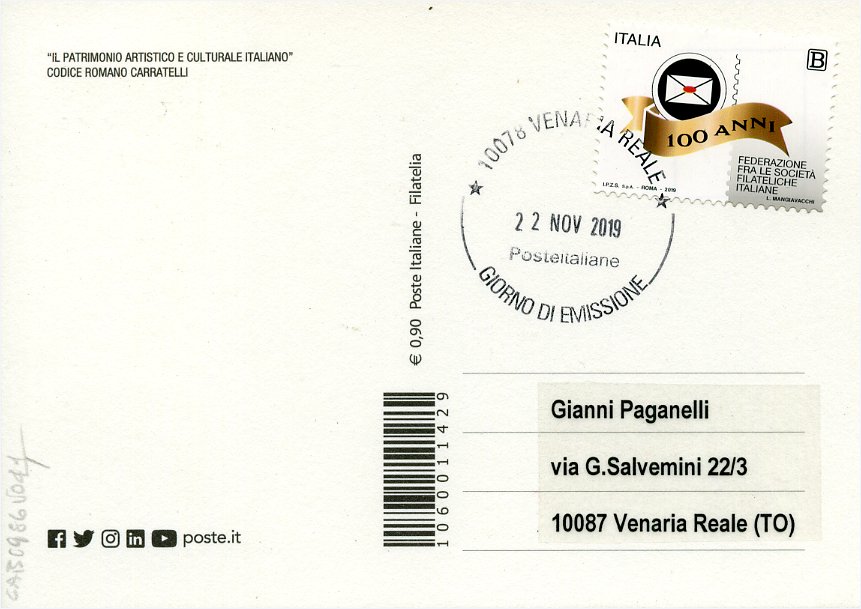 2019 IT - EM0065 - CAB1986 - 1v - 22/11/2019 - Federazione fra le Società Filateliche Italiane