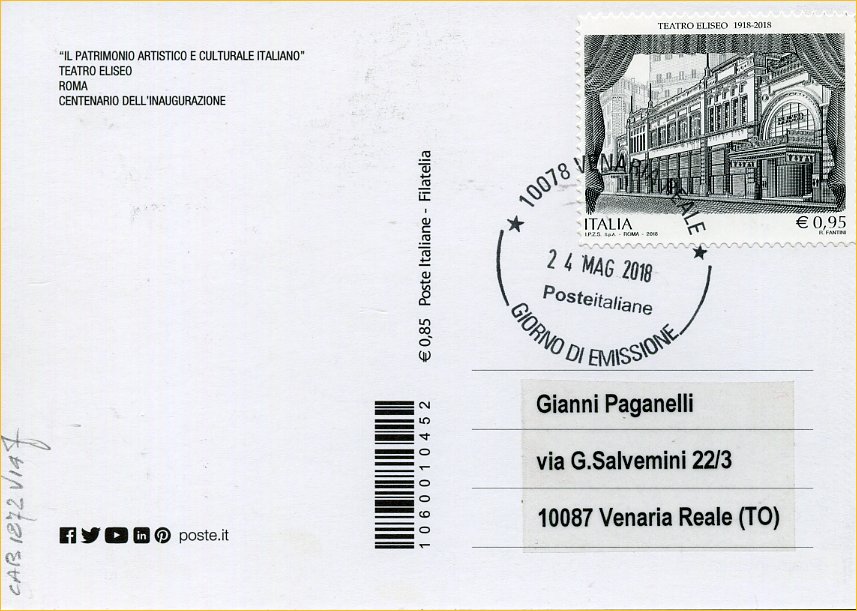 IT3886 - 24/05/2018 - CAB1872 - 1v - 100° anniversario dell´inaugurazione del Teatro Eliseo, a Roma
