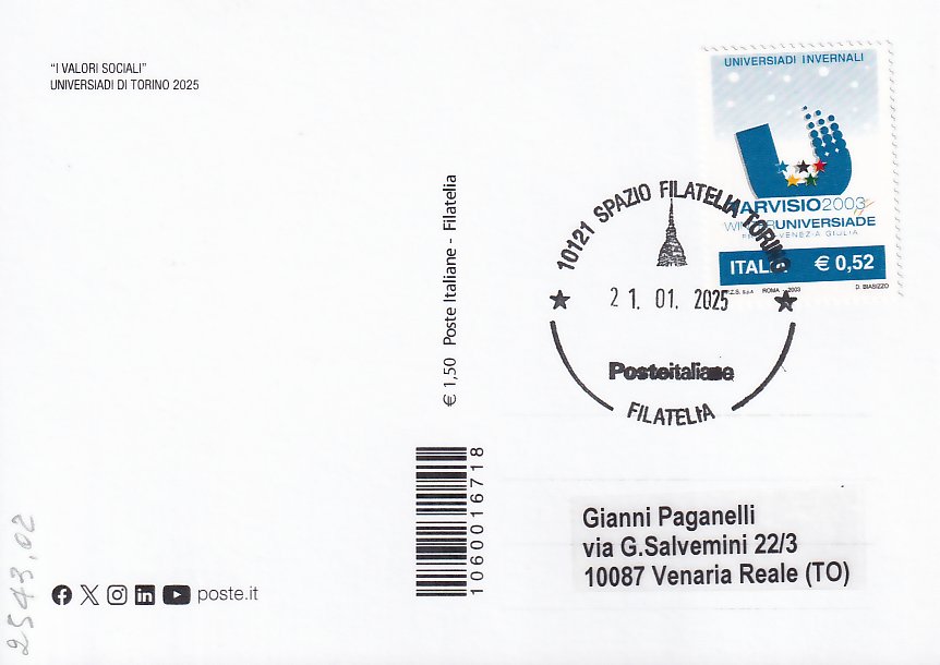 2025 IT - EM001 - CAB2543 - 1v - 13/01/2025 - I Valori Sociali. Francobollo dedicato alle Universiadi di Torino